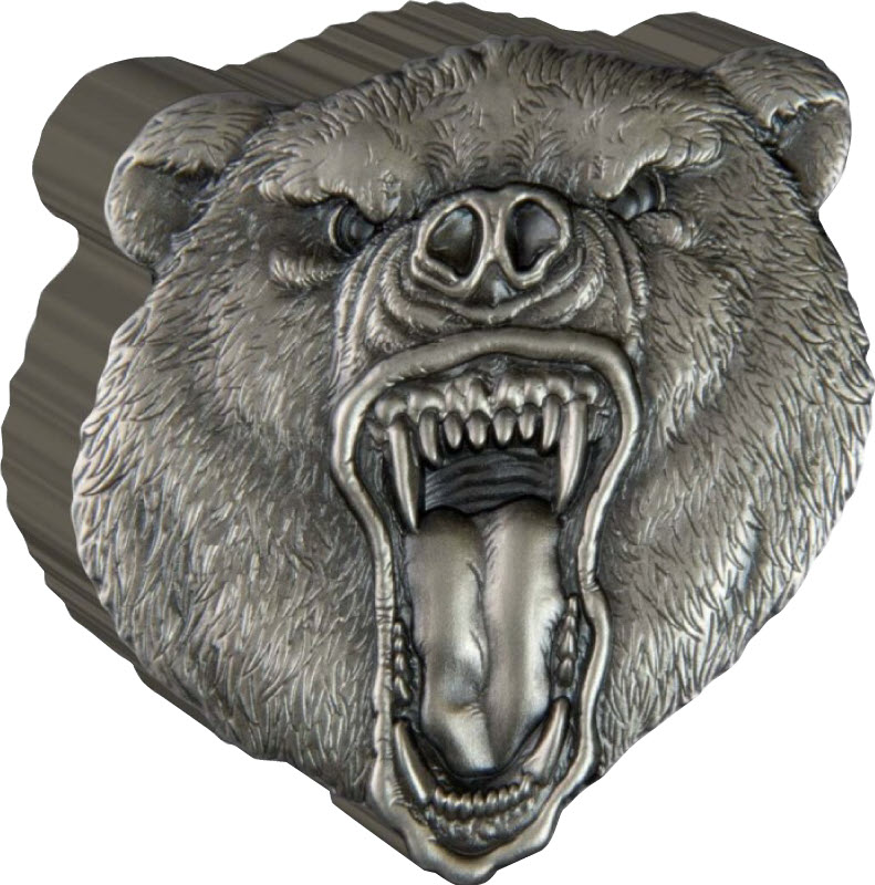 Монета, выполненная в форме головы медведя с широко раскрытой пастью. Античная отделка и реалистичность гравировки делают данную монету особо впечатляющей. Монета находится в акриловой капсуле, отлитой по ее форме и упакована в тематический футляр. Сертификат подлинности прилагается. Ограниченный тираж — 2000 штук.