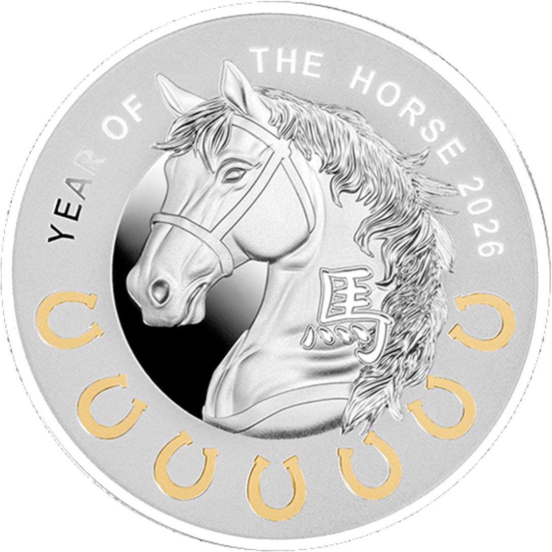 На реверсе изображена голова лошади. На шее иероглиф: 馬 (Лошадь). Вверху вдоль канта надпись: YEAR OF THE HORSE 2026. Внизу семь подков принесут вам удачу в течение всего Года Лошади.