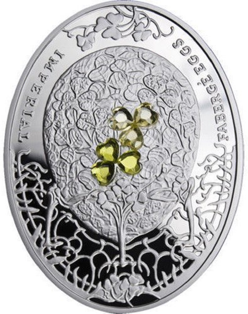 Монета «Clover Leaf Egg» - третья монета популярной серии «Imperial Fabergé Eggs». Низкий тираж, уникальный дизайн, стеклянные вставки и цирконы в форме клевера делают монету очень привлекательной для коллекционеров.