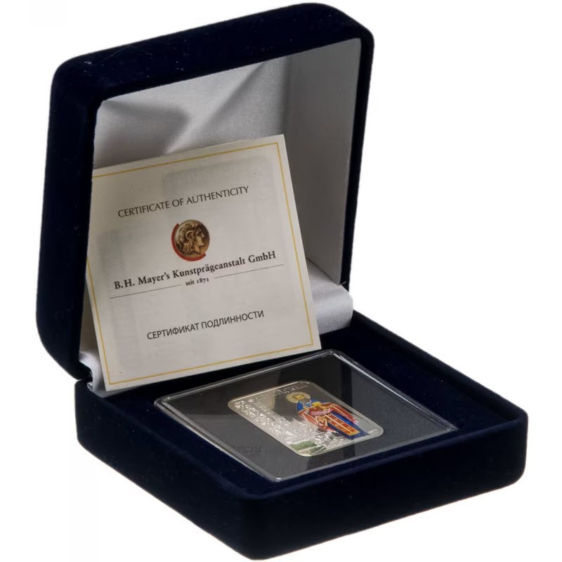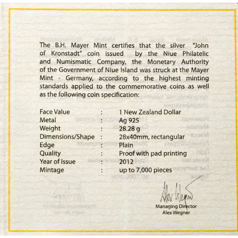 Эта памятная серебряная монета Ниуэ посвящена Иоанну Кронштадтскому. У нее размеры 28 х 40 мм, качество пруф и селективная окраска. Поставляется в оригинальном футляре с сертификатом подлинности. Тираж: 7000 штук.