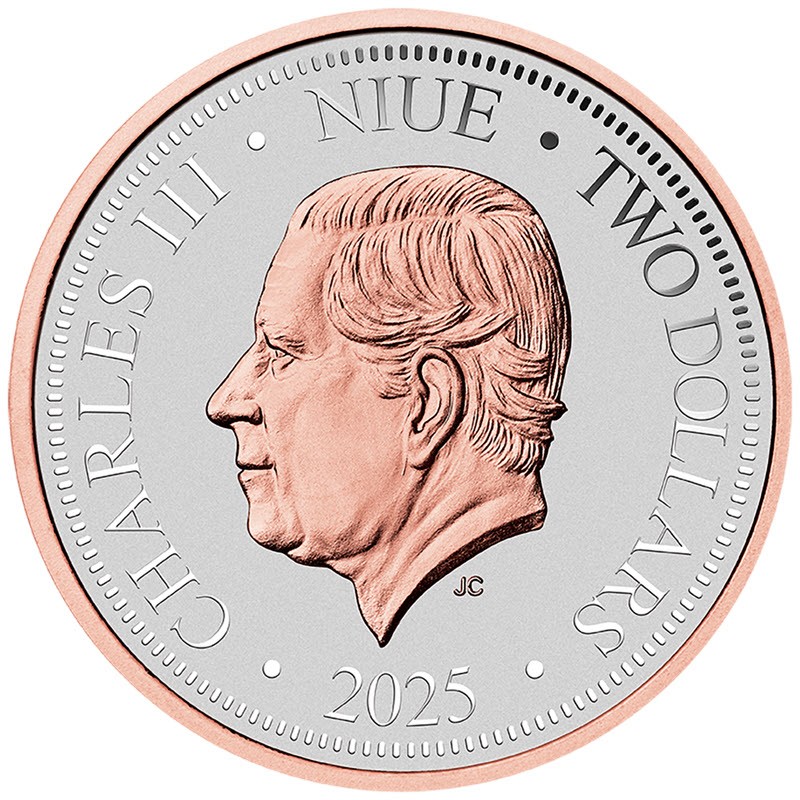 На аверсе изображен Его величество Король Чарльз III. Под шеей инициалы дизайнера JC (Jody Clark). Вдоль канта надписи: CHARLES III · NIUE · TWO DOLLARS · 2025 · (Чарльз III, страна-эмитент, номинал, год чеканки).