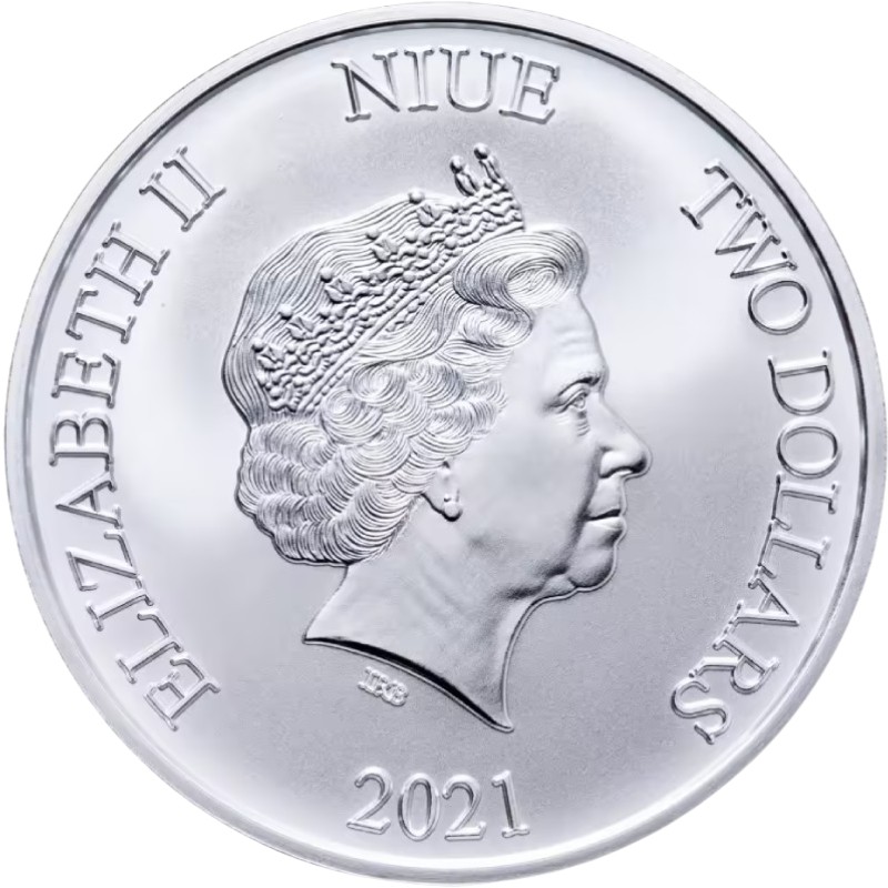 В центре - портрет Ее Величества Королевы Елизаветы II работы дизайнера Яна Рэнка-Бродли. Вдоль канта надписи: ELIZABETH II  NIUE  TWO DOLLARS  2021 (Елизавета II, страна-эмитент, номинал, год чеканки).