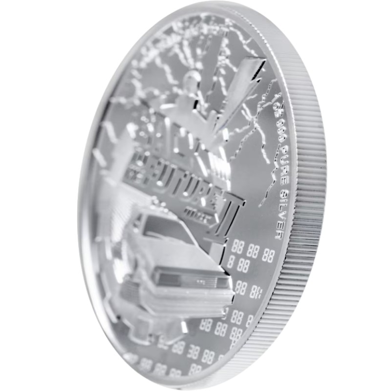 Эта чудесная 1 унцовая серебряная монета посвящена второму фильму трилогии «Back to the Future» («Назад в будущее») - классике научной фантастики о путешествиях во времени безумного учёного доктора Эмметта «Дока» Брауна и молодого Марти Макфлая.