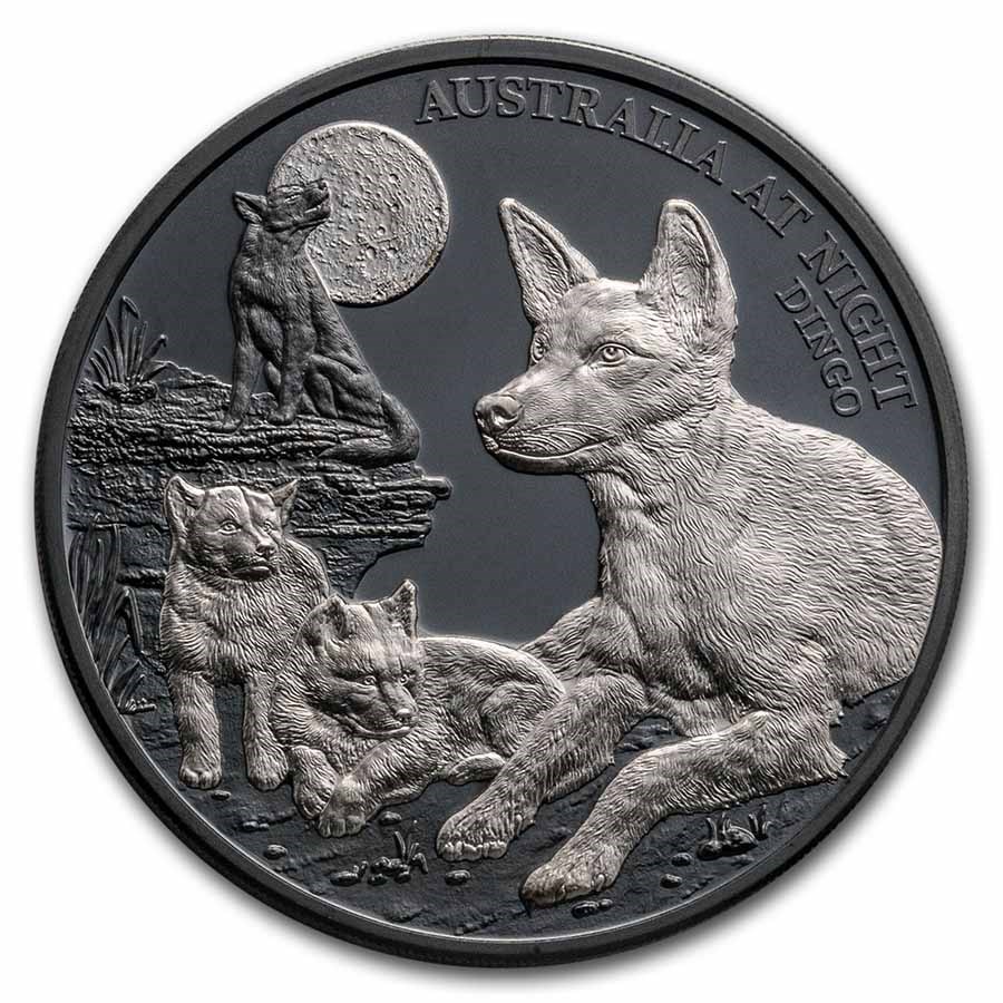 Изображен взрослый динго со своими детенышами, а на заднем плане - еще один динго, воющий на луну. Взрослый динго и щенки выделены платиновым цветом.