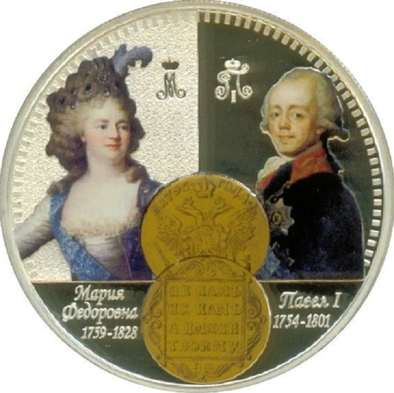 Серебряная монета с цветным изображением императорской четы и реплики монеты времен Павла I.