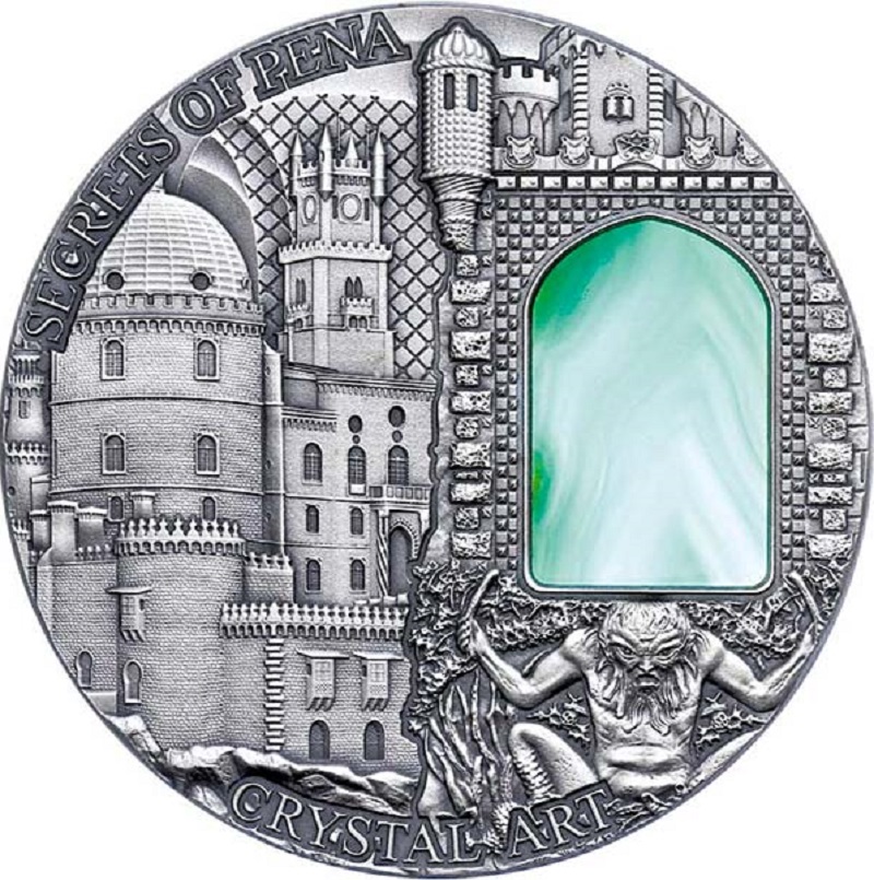 На реверсе монеты прекрасное детальное изображение замка Пена и красивая хрустальная вставка. Вверху на реверсе надпись: "SECRETS OF PENA" - название монеты. Внизу надпись: "CRYSTAL ART" - название серии.
