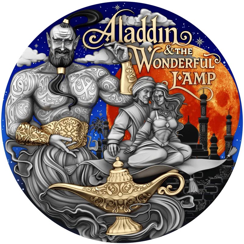 Эта удивительная серебряная монета весом в 2 унции от литовского монетного двора T&S Coin посвящена Аладдину. У нее качество античной отделки, высокий рельеф, выборочное золочение и селективная окраска. Поставляется в оригинальном футляре с сертификатом подлинности. Тираж: 500 штук.