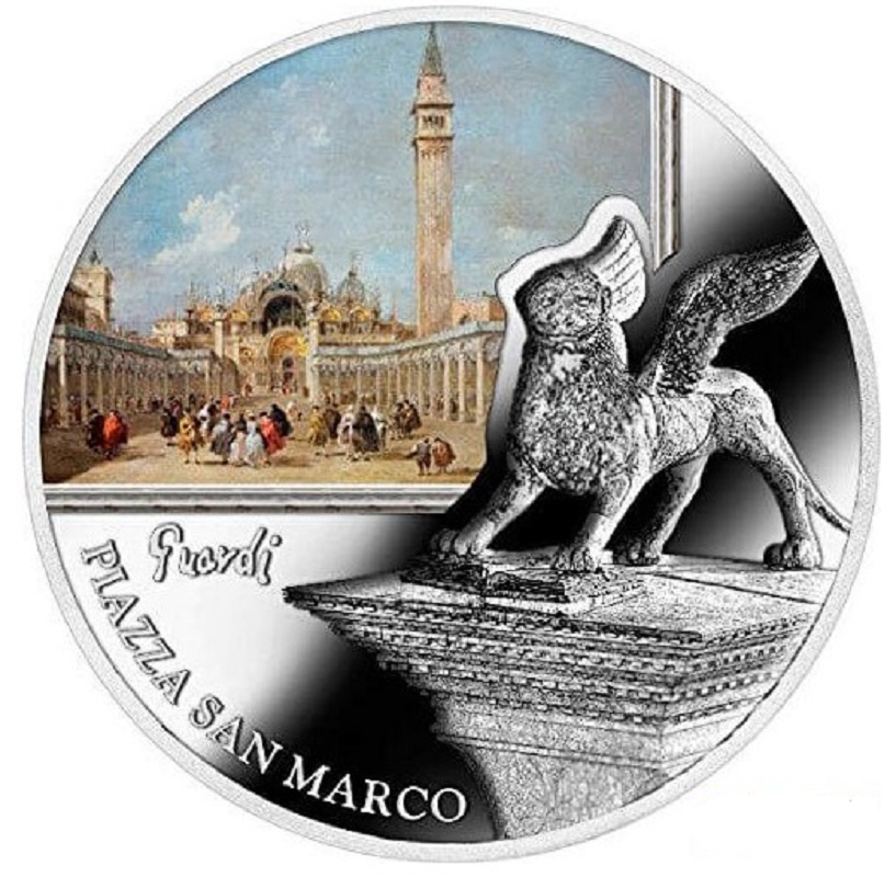 Эта красивая монета из чистого серебра, окрашенная с использованием технологии цифровой печати и качества Proof из серии "SOS Венеция". На ней изображена знаменитая картина Франческо Гварди, площадь Сан-Марко с видом на средневековую базилику, колокольню, аркады Старой прокуратуры и Новой прокуратуры. Ограниченный тираж всего 777 экземпляров по всему миру.