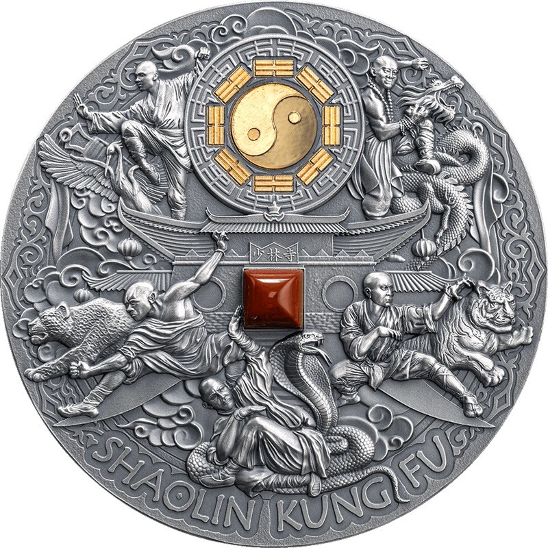 Эта удивительная серебряная монета весом в 5 унций является шестой и последней из серии «Стили боевые искусства», посвященной шаолиньскому кунг-фу. На ней изображены прекрасные горельефы, выборочное золочение и вставка из яшмы. Она имеет античную отделку и поставляется в футляре вместе с сертификатом подлинности. Тираж: 333 штуки.