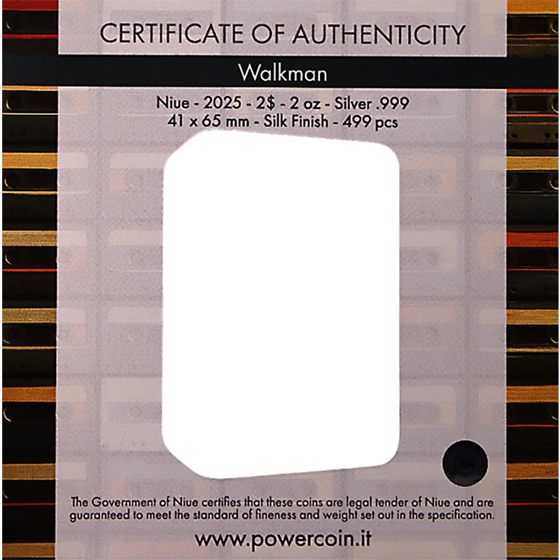 Эта удивительная серебряная монета весом в 2 унции посвящена знаменитому плееру Walkman размером 65 Х 41 мм. Она четвертая из серии «TechStalgic», которая прославляет пересечение цифровых технологий 80-90 годов и ностальгии. У нее качество пруф. Поставляется в футляре с сертификатом подлинности. Тираж: 499 штук.