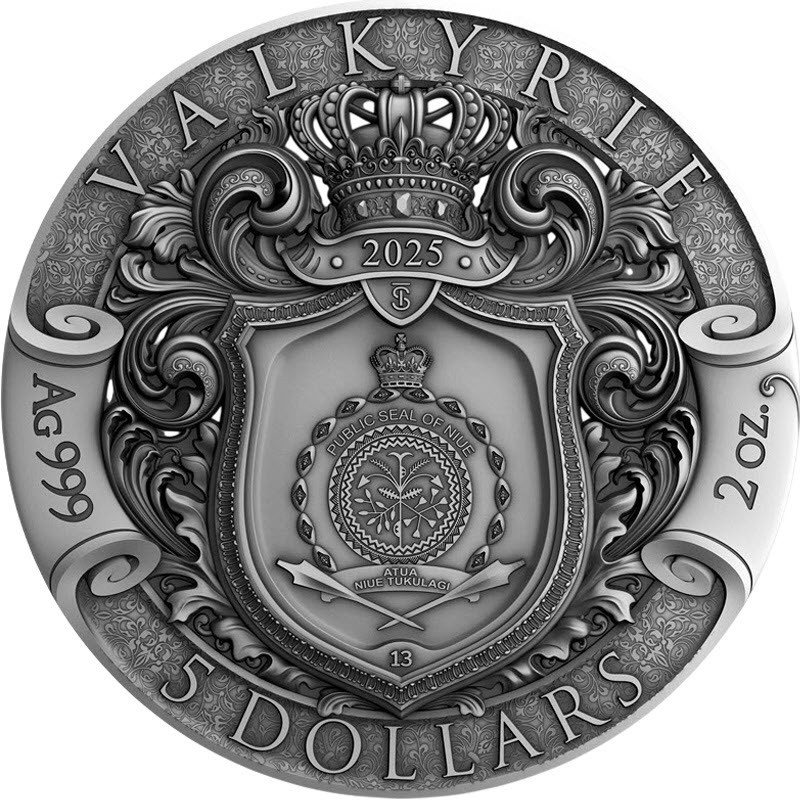 На аверсе на щите изображена неофициальная «Государственная печать Ниуэ». Это композиция из растений в центре внутри двойного декоративного круга, окруженного морскими раковинами. Он увенчан короной Святого Эдуарда (символом Соединенного Королевства, монарх которого в конечном итоге является главой государства Ниуэ). Сверху между ними надпись PUBLIC SEAL OF NIUE. Ниже на ленте в две строки изображен девиз ATUA NIUE TUKULAGI, ниже которых две перекрещенные катуа. Над щитом надпись: • 2025 • TS (год чеканки, монограмма монетного двора), под щитом: 13. Вдоль канта надпись: VALKYRIE Ag 999 5 DOLLARS 2 oz. (название монеты, вес и проба серебра, номинал).