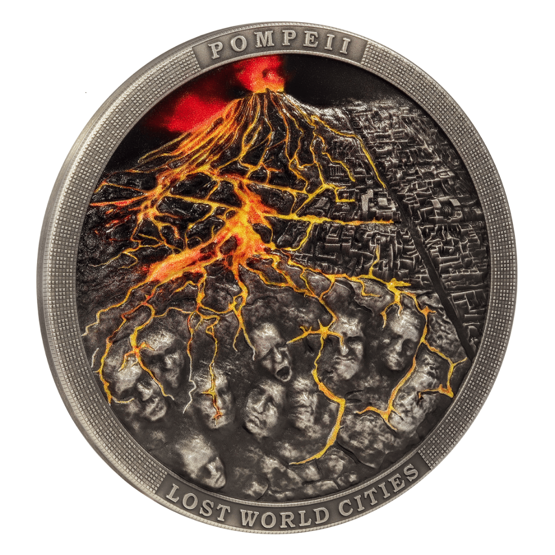 Эта красивая серебряная монета весом в 2 унции представляет собой выпуск из серии «Затерянные города мира». На ней изображены Помпеи, древний римский город, разрушенный и похороненный в результате извержения Везувия в 79 году нашей эры. Монета имеет античную отделку и поставляется в цвете «антик». деревянный футляр вместе с сертификатом подлинности. Ограниченный тираж 500 штук по всему миру.