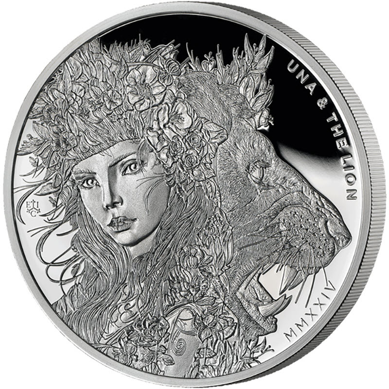 На реверсе изображены решительная Уна и свирепый Лев. Слева у канта монограмма Ост-Индийской Компании: EIC. Вверху справа надпись: UNA & THE LION (Уна и Лев), внизу: MMXXIV (год чеканки).