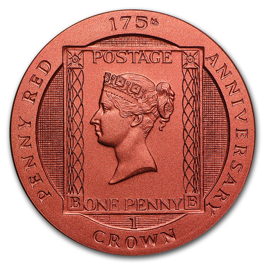 На реверсе расположен молодой портрет королевы Виктории на стилизованном отображении почтовой марки. По ободу полукругом находятся следующие надписи: «PENNY RED 175th ANNIVERSARY» (Красный пенни 175-тая годовщина). Внизу указан номинал и валюта номинала в две строки: «1 CROWN» (1 крона).