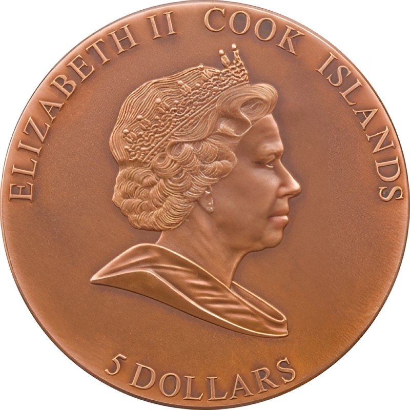На аверсе монеты изображен профиль Ее Величества королевы Великобритании Елизаветы II дизайнера Яна Рэнк-Бродли (IRB). Вверху вдоль канта надписи: ELIZABETH II COOK ISLANDS (Елизавета II, страна-эмитент) Внизу: 5 DOLLARS (номинал монеты).