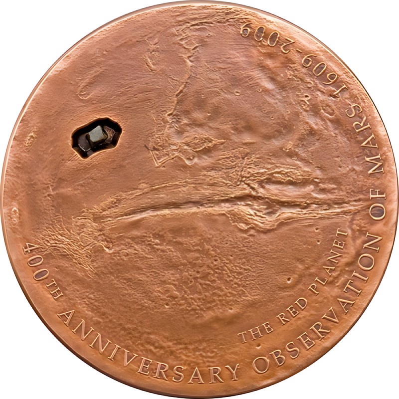 Эта необычная серебряная монета посвящена 400-летию первого телескопического наблюдения Марса. Внешний вид монеты напоминает о "красной планете" - при изготовлении этой серебряной монеты использовалось покрытие тонким слоем меди, что и придало ей красновато-коричневый оттенок. В монету инкрустирован фрагмент марсианского метеорита типа NWA 4925.