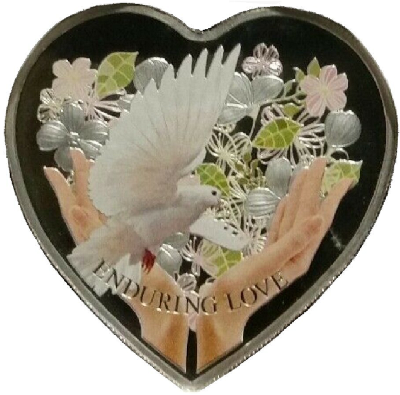 Две руки, держащие цветы и голубя. Надпись — "ENDURING LOVE"