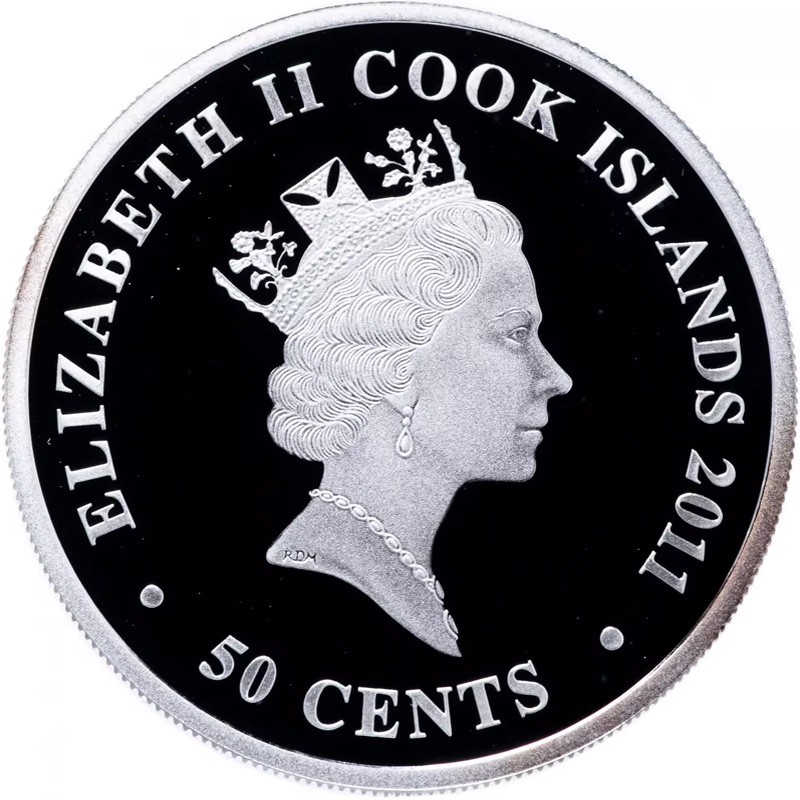 На аверсе монеты изображен профиль Ее Величества королевы Елизаветы II дизайнера Рафаэля Маклауфа (RDM). Вверху вдоль канта надписи: ELIZABETH II COOK ISLANDS 2011 (Елизавета II, страна-эмитент, год чеканки). Внизу: 50 CENTS (номинал).