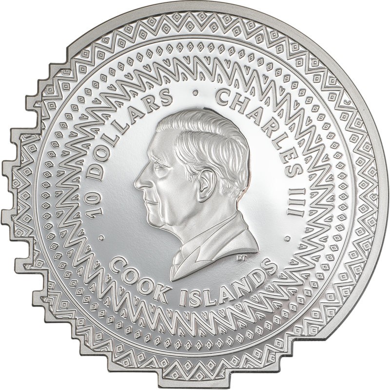 На аверсе изображен Его Величество король Чарльз III. Внизу портрета инициалы дизайнера TD (Dan Thorne). Вдоль канта надпись: 10 DOLLARS · CHARLES III · COOK ISLANDS · (номинал, Чарльз III, страна-эмитент).