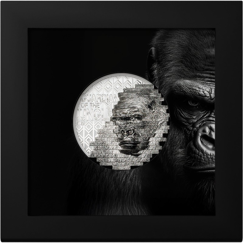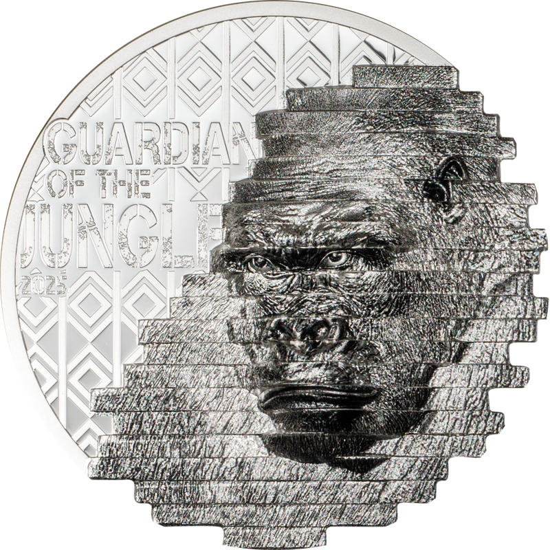 На реверсе изображена горилла. Слева надпись: GUARDIAN OF THE JUNGLE 2025 (Хранитель джунглей, год чеканки).