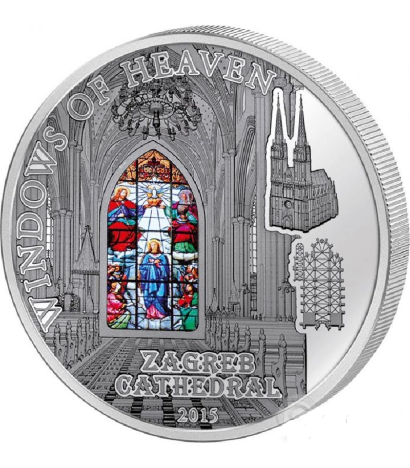 Серебряная монета Островов Кука "Окна в Небеса. Загребский собор" 2015 г.в., 46.25 г чистого серебра (Проба 925)
