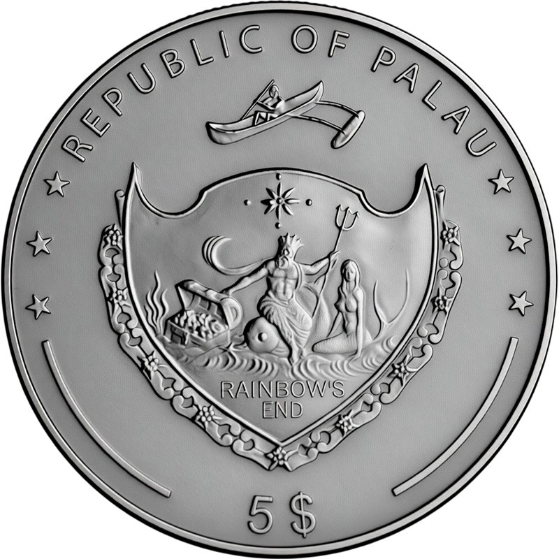 В центре в круге – неофициальный герб Республики Палау – щит, в центре которого на круглом камне сидит морской бог Посейдон в короне и держит трезубец. Слева – сундук с сокровищами, справа – русалка. Над Посейдоном видна звезда, а под волнами находится надпись RAINBOW'S END (Конец радуги). Над щитом – изображение человека в каноэ. Вверху полукругом надпись: ***REPUBLIC OF PALAU *** (страна-эмитент). Внизу: 5$ (номинал).