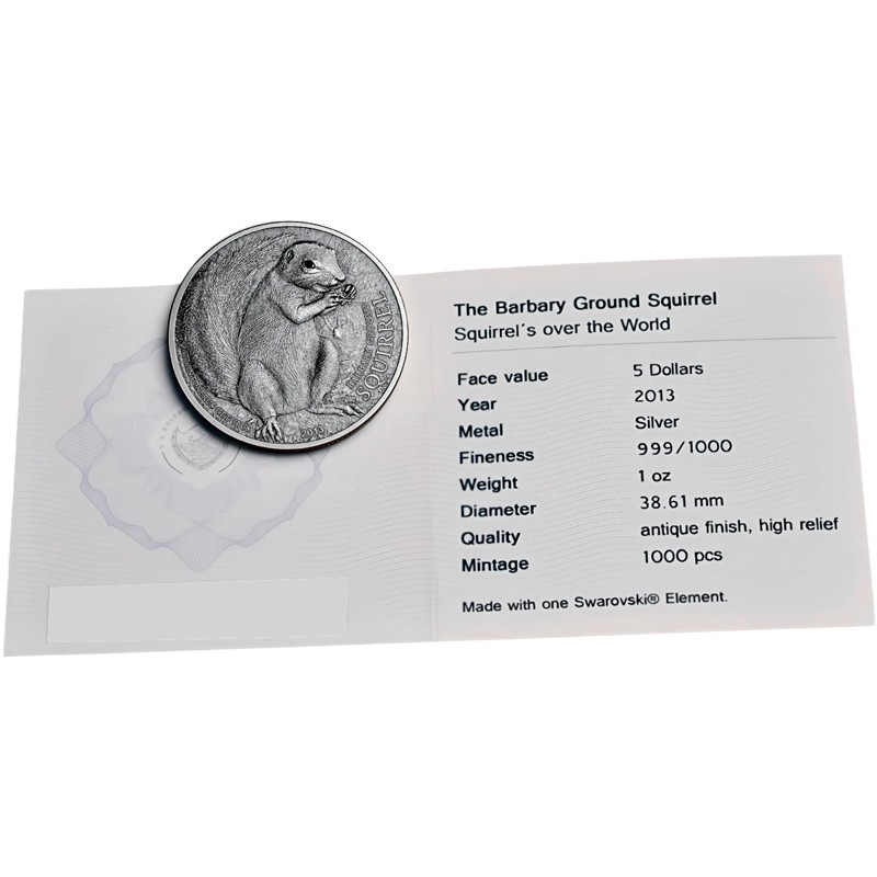 Эта чудесная 1 унцовая серебряная монета из серии «Белки со всего мира» (Squirrels over the World) , посвящена Берберийской земляной белке (The Barbary Ground Squirrel).