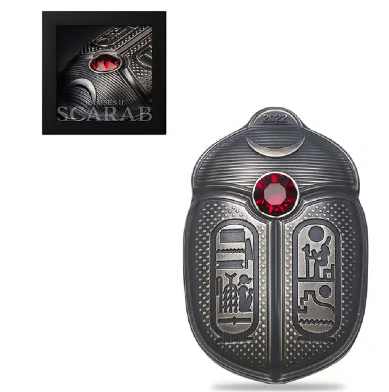 Реверс монеты имеет форму скарабея с великолепной вставкой Swarovski, невероятный дизайн, и он полон египетских символов, раскрывающих имя рождения фараона Рамзеса II, а также его тронное имя в стиле иероглифов. В верхней части реверса надпись: "2022" - год выпуска.