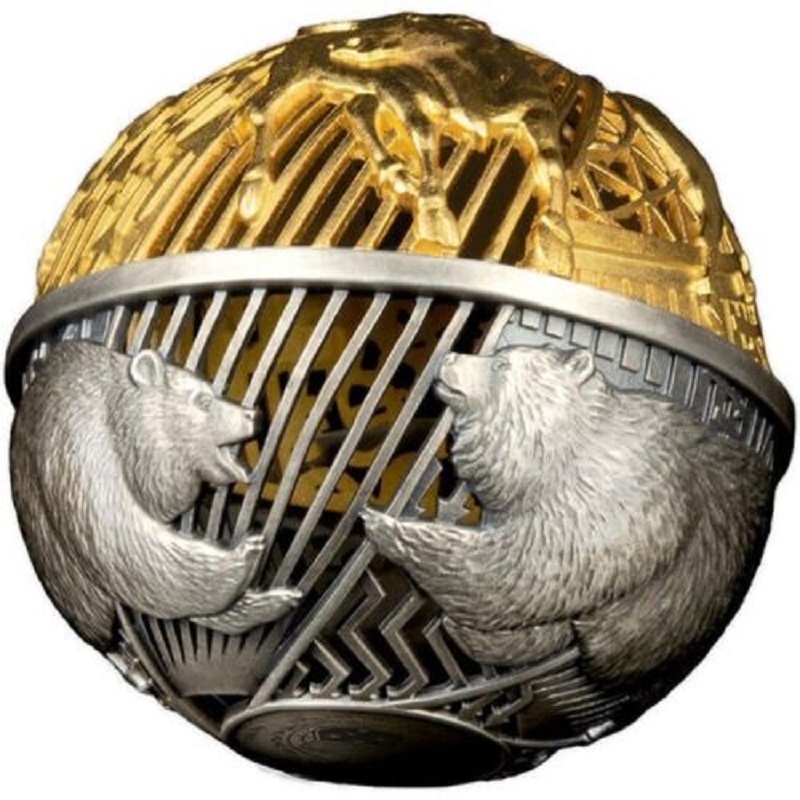 Эта замечательная серебряная монета весом в 2 унции посвящена Быку и Медведю, подъему и падению фондового рынка. Монета представляет собой идеальную полую сферу с вырезами, качество античной отделки с селективным золотым покрытием и она поставляется в тематическом футляре вместе с сертификатом подлинности. Ограниченный тираж 1499 штук по всему миру.