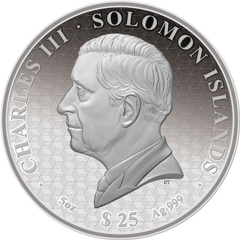 На аверсе изображен Его Величество король Чарльз III. Под портретом инициалы дизайнера TD (Dan Thorne). Вдоль канта надпись: CHARLES III · SOLOMON ISLANDS · 5 oz $25 Ag 999 · (Чарльз III, страна-эмитент, вес и проба серебра, номинал).