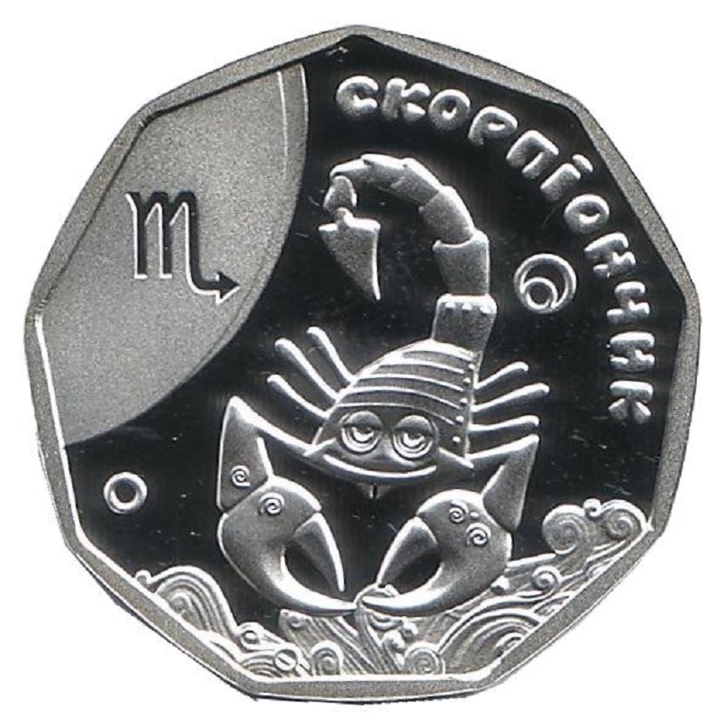 Реверс — символ знака зодиака Скорпиона, в центре — скорпион, надпись «СКОРПІОНЧИК».