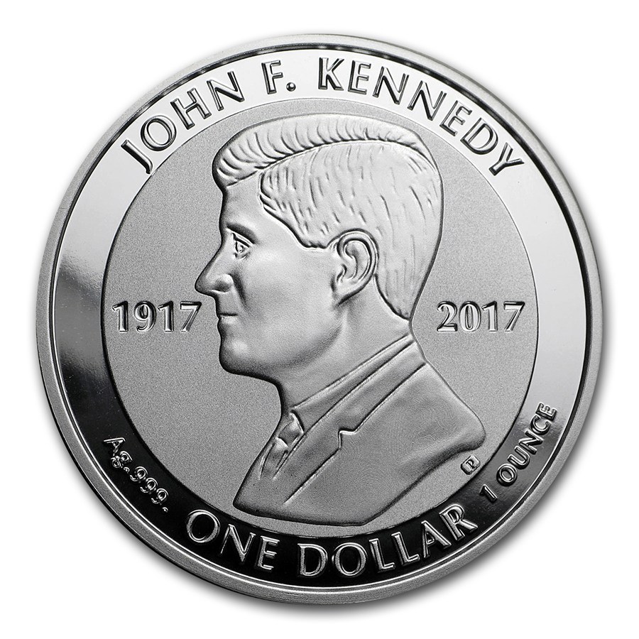На реверсе изображен портрет президента США Джона Ф. Кеннеди. Годы юбилея разделены его портретом – «1917-2017». По ободу полукругом внизу стоят следующие надписи: «Ag. 999 ONE DOLLAR 1 OUNCE» (серебро 0,999 пробы, 1 доллар США, 1 тройская унция), а вверху: «JOHN F. KENNEDY» (Джон Ф. Кеннеди).