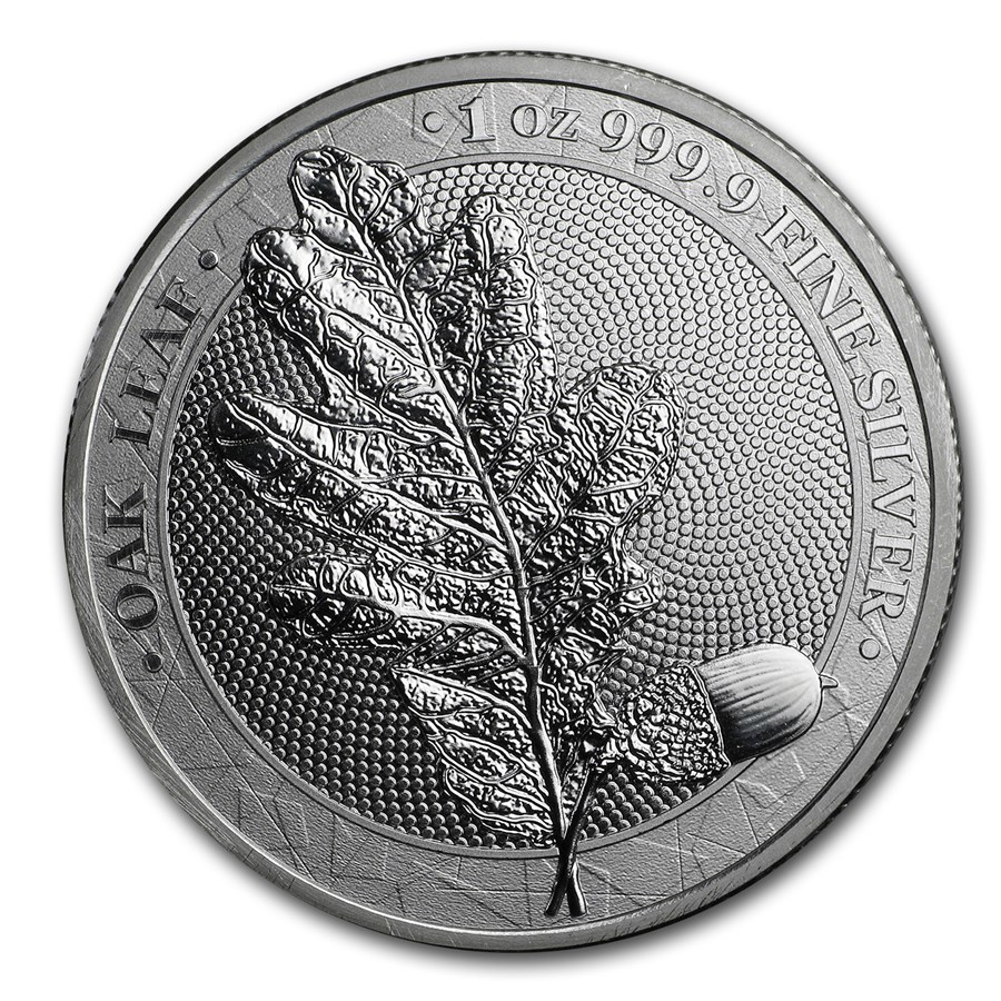 Изображение дубового листа с желудем. По боду надпись-название — OAK LEAF (Дубовый лист), вес и чистота металла — 1oz 999.9 FINE SILVER