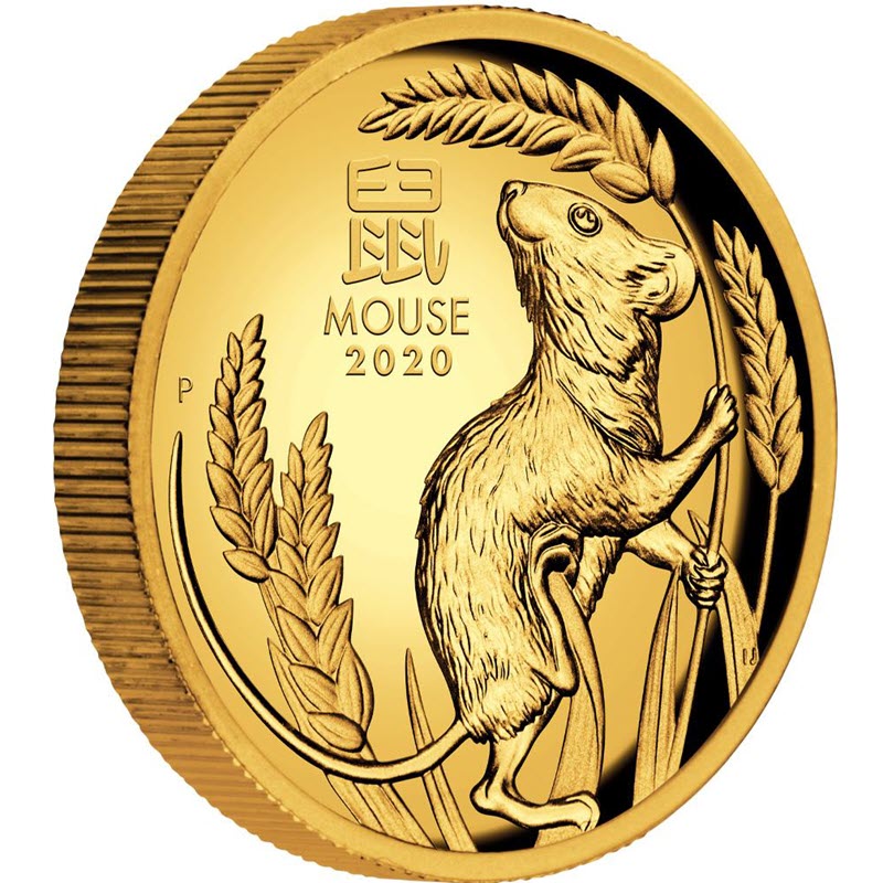 Реверс: изображает мышь среди стеблей пшеницы. В дизайн также включены китайский иероглиф «мышь», надпись «Мышь 2020» и знак «Р» монетного двора Перта.