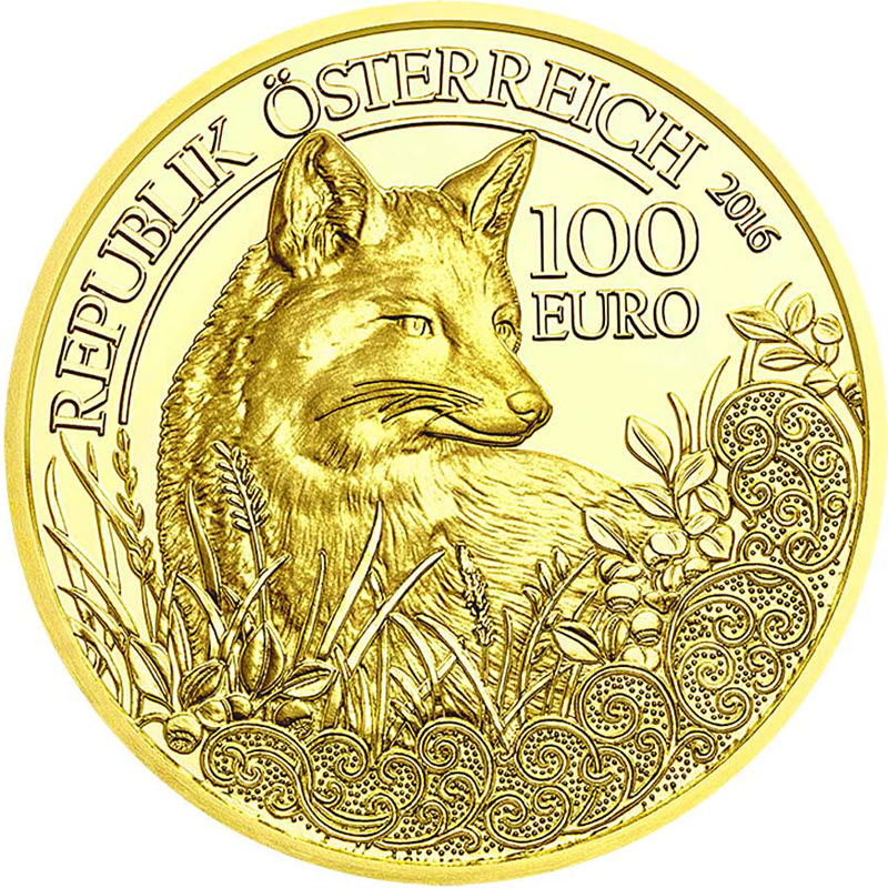 На аверсе изображена европейская красная лисица, сидящая в гуще разнотравья, окруженном декоративным орнаментом. Справа от нее обозначен номинал монеты: «100 EURO» (100 евро). Сверху по канту полукругом надпись: «REPUBLIK OSTERREICH» (Республика Австрия) и год выпуска монеты – «2016».