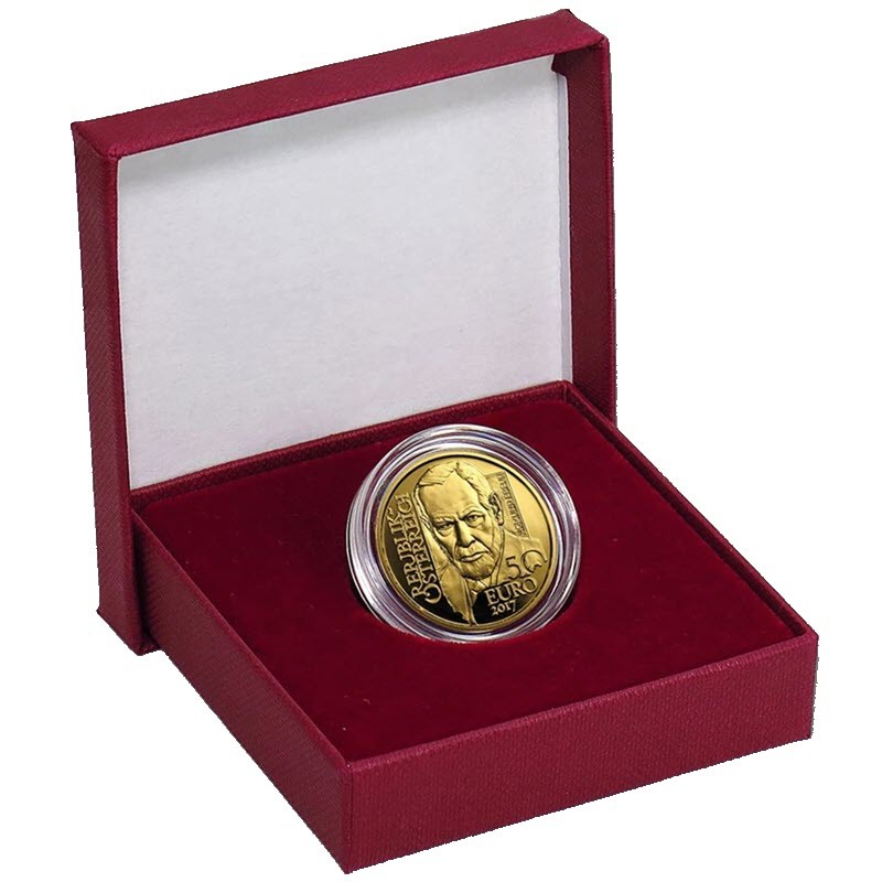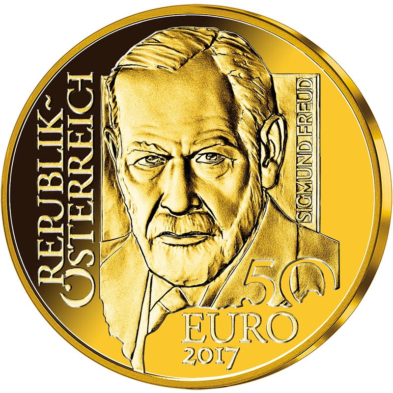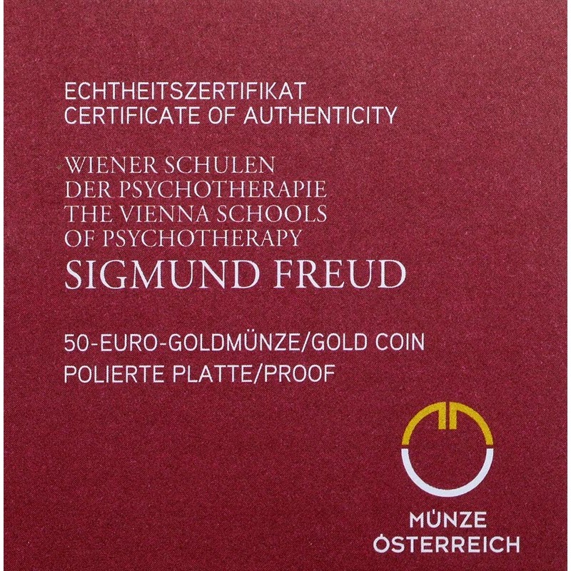 Золотая монета Австрии «Зигмунд Фрейд» - первая из серии «Венские школы психотерапии». Дизайнеры Helmut Andexlinger и Herbert Wähner. У нее качество пруф. Поставляется в оригинальном футляре с сертификатом подлинности. Тираж: 20000 штук.