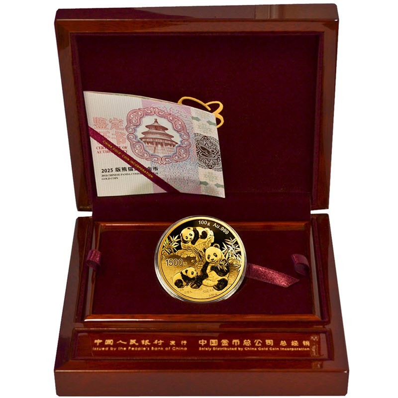 Золотая монета Китая "Панда" 2025 г.в. (пруф), 100 г чистого золота (проба 999)