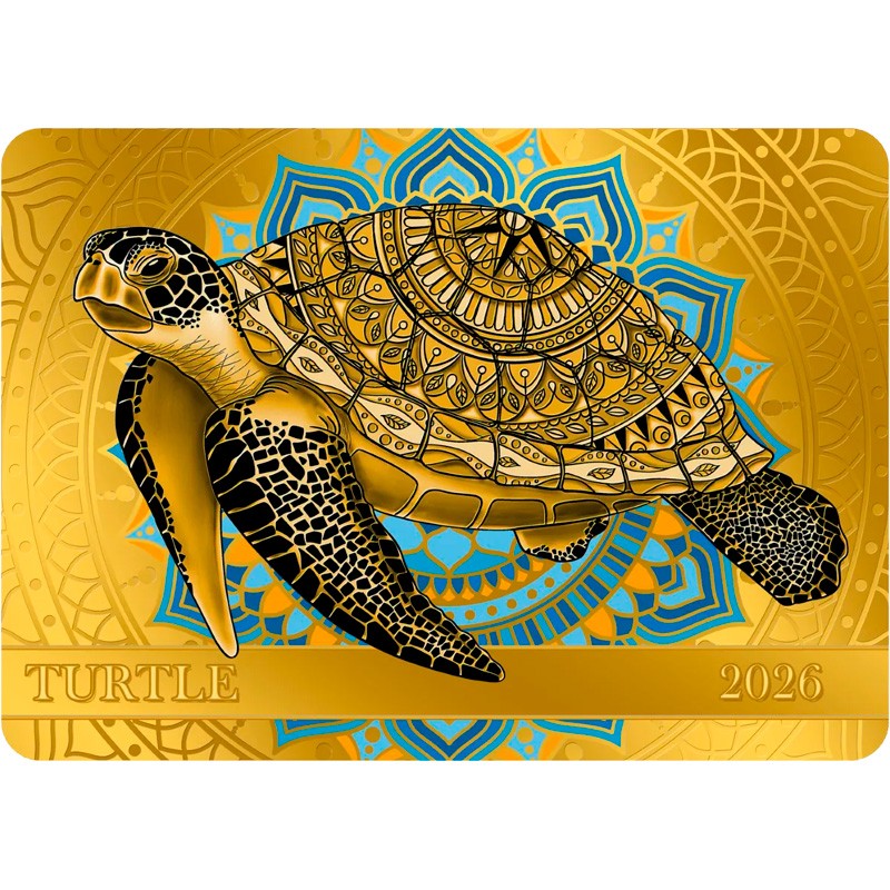 На реверсе изображена черепаха в ярком стиле мандалы. Слева внизу надпись – TURTLE (Черепаха), справа – 2026 (год чеканки).