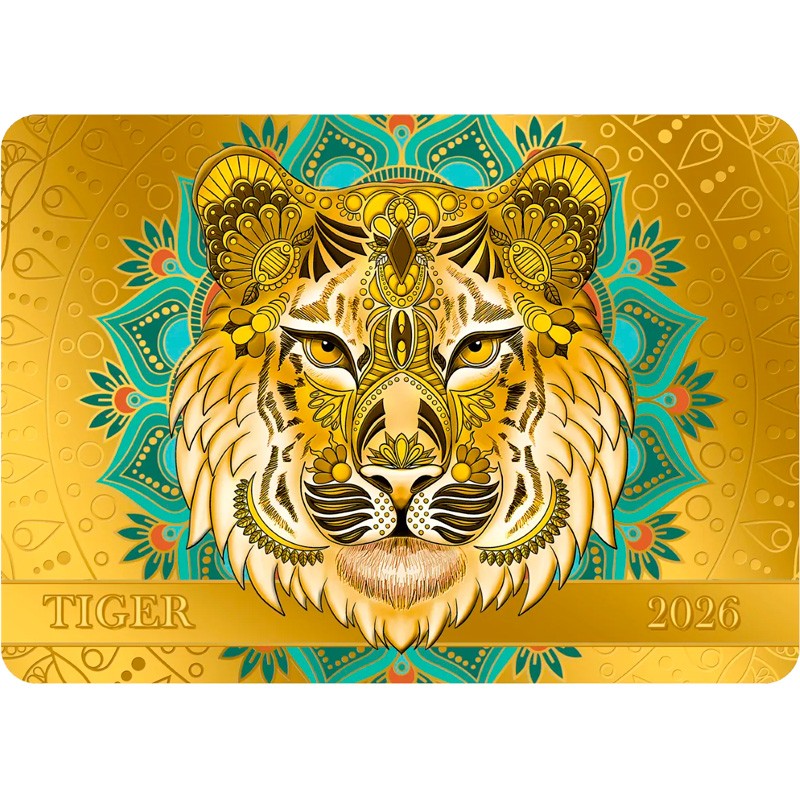 На реверсе изображен тигр в ярком стиле мандалы. Слева внизу надпись – TIGER (тигр), справа – 2026 (год чеканки).