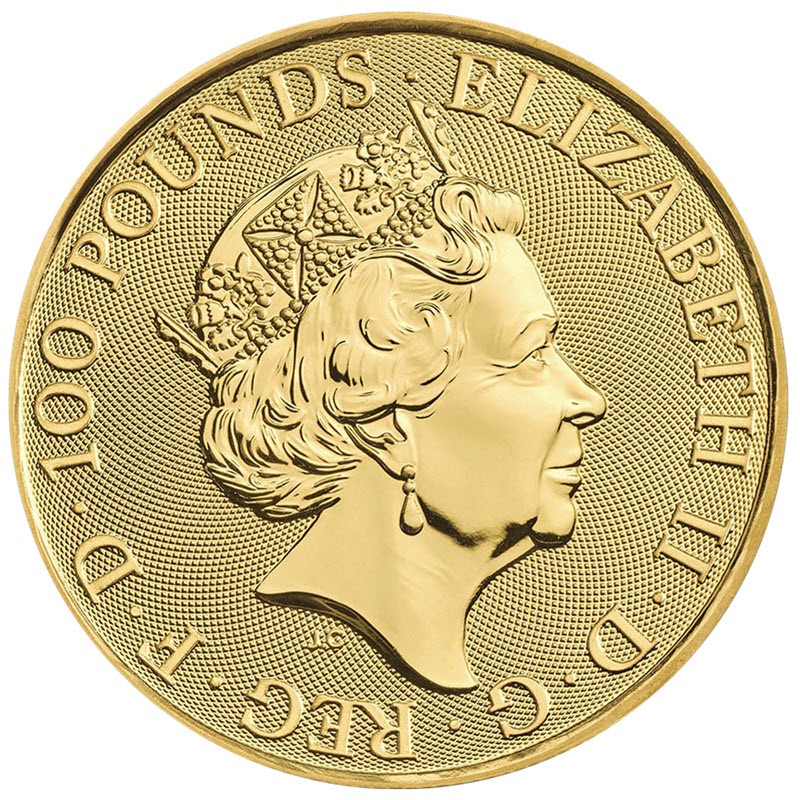 На аверсе изображена Ее Величество королева Елизавета II с бриллиантовой  диадемой. Под головой инициалы дизайнера JC (Jody Clark). Вдоль канта надпись: ELIZABETH II · D · G · REG · F · D · 100 POUNDS · (Елизавета Вторая, божьей милостью, королева, защитница веры, номинал).