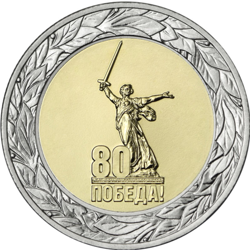 Российская памятная стальная монета 2025 г. Банка России из серии «Юбилей Победы советского народа в Великой Отечественной войне 1941–1945 гг.». Сделана в виде: кольцо/диск - сталь с никелевым гальваническим покрытием/сталь с латунным гальваническим покрытием. Тираж: 1 000 000 штук.