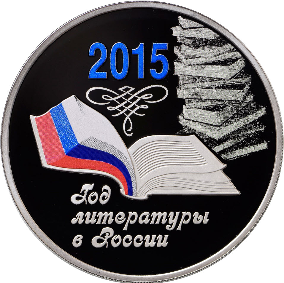 Серебряная монета Банка России 2015 года посвящена Году литературы в России. У нее качество пруф и селективная окраска. Тираж: 3000 штук.