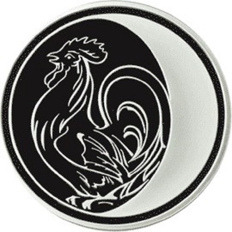 в круге, обрамленном сплошным ободком, слева – профильное изображение петуха, справа – матированное изображение полумесяца.