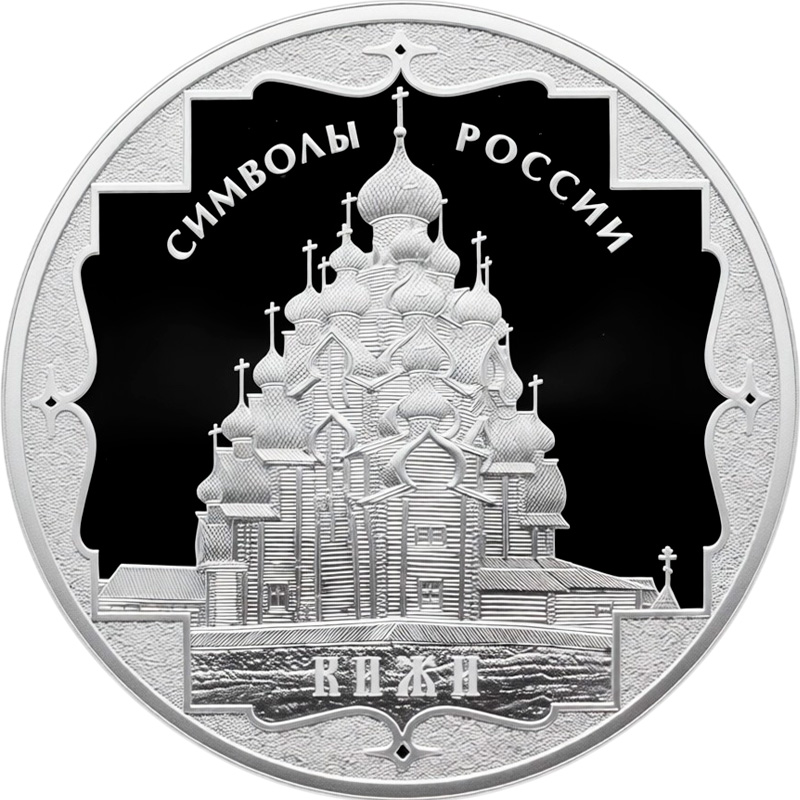 в центре диска в картуше – изображение деревянной Преображенской церкви в Кижах, внизу – надпись: "КИЖИ", вверху вдоль канта – надпись: "СИМВОЛЫ РОССИИ".