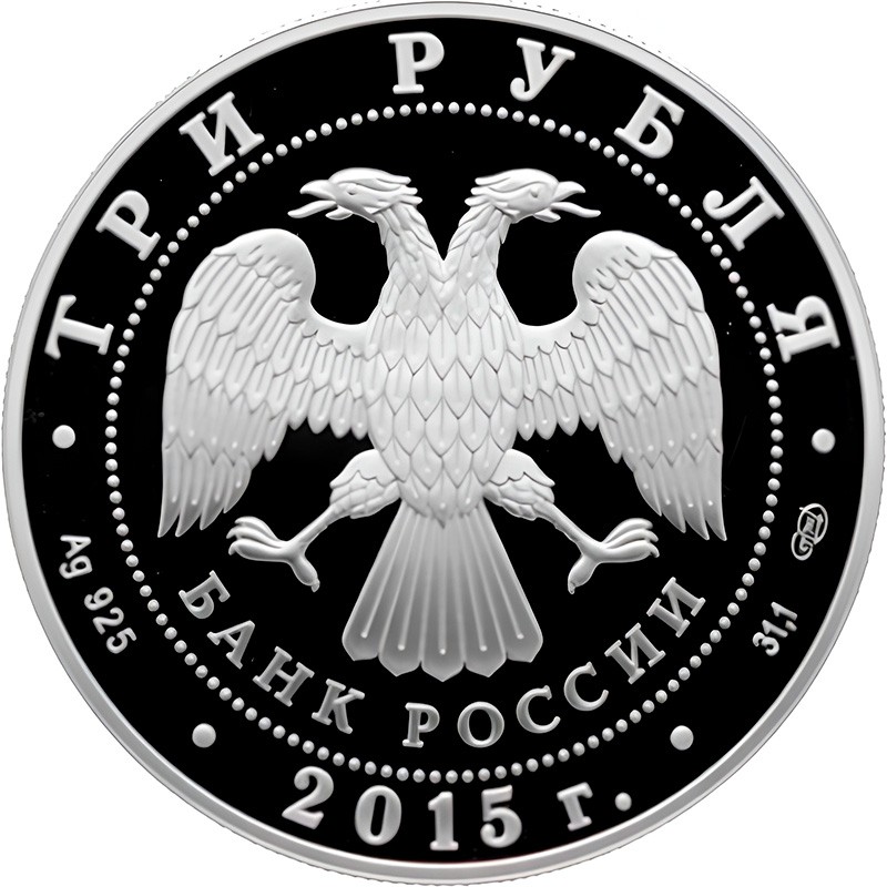 в центре – эмблема Банка России (двуглавый орёл с опущенными крыльями, под ним – надпись полукругом "БАНК РОССИИ"), обрамленная кругом из точек и надписями по кругу – вверху: "ТРИ РУБЛЯ", внизу: слева – обозначения драгоценного металла и пробы сплава, в центре – год выпуска "2015 г.", справа – содержание химически чистого металла и товарный знак монетного двора.