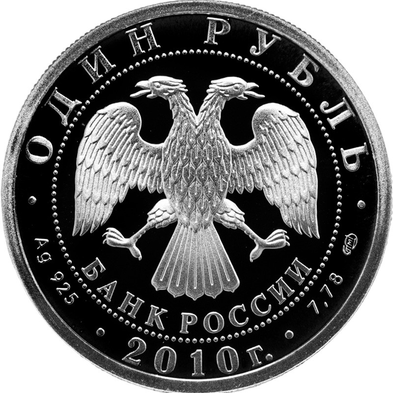 Рельефное изображение эмблемы Банка России. Над ним вдоль канта надпись: ОДИН РУБЛЬ (номинал). Слева надпись: Ag 925 (проба серебра), справа: 7,78 СПМД (вес серебра, монограмма монетного двора). Внизу надпись в две строки: БАНК РОССИИ 2010 г. (банк, год чеканки).