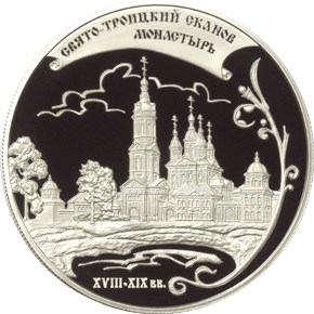 архитектурный ансамбль монастыря, справа - стилизованное изображение ветви, внизу - даты "XVIII-XIX вв.", вверху на матовом фоне свитка - надпись в две строки: "СВЯТО- ТРОИЦКИЙ СКАНОВ МОНАСТЫРЬ".