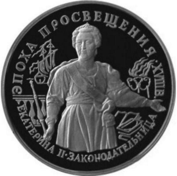 На реверсе изображена императрица Екатерина II, которая держит скипетр в руке. Слева от нее отчеканен образ корабля, а справа – жертвенника с огнем и книги. Вверху по ободу полукругом надпись: «ЭПОХА ПРОСВЕЩЕНИЯ. XVIII ВЕК», а внизу – «ЕКАТЕРИНА II. ЗАКОНОДАТЕЛЬНИЦА».