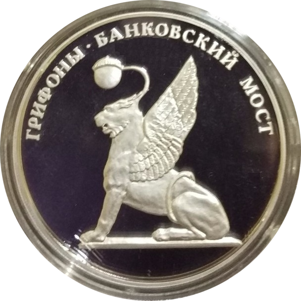 Серебряный жетон России «Грифоны. Банковский мост» посвящен знаменитому пешеходному цепному мосту в Петербурге. Жетон отчеканен Санкт-Петербургским монетным двором в честь 300-летия города.