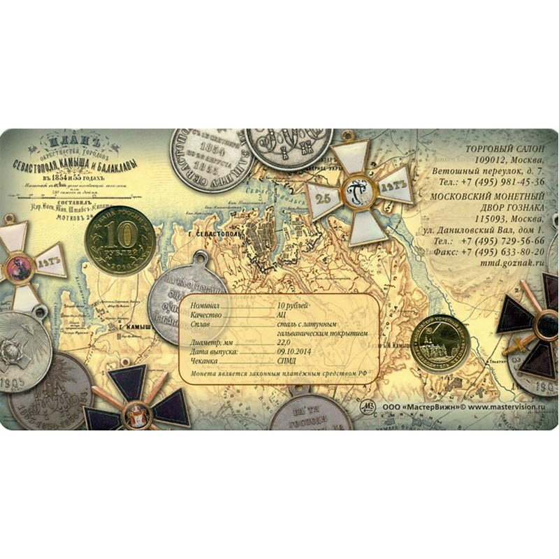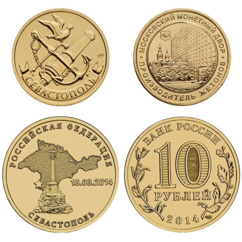 Блистер с монетой и жетоном 2014 г. «Севастополь» посвящен его вхождению в состав Российской Федерации. У них качество анциркулейтед. Тираж: 2000 штук.
